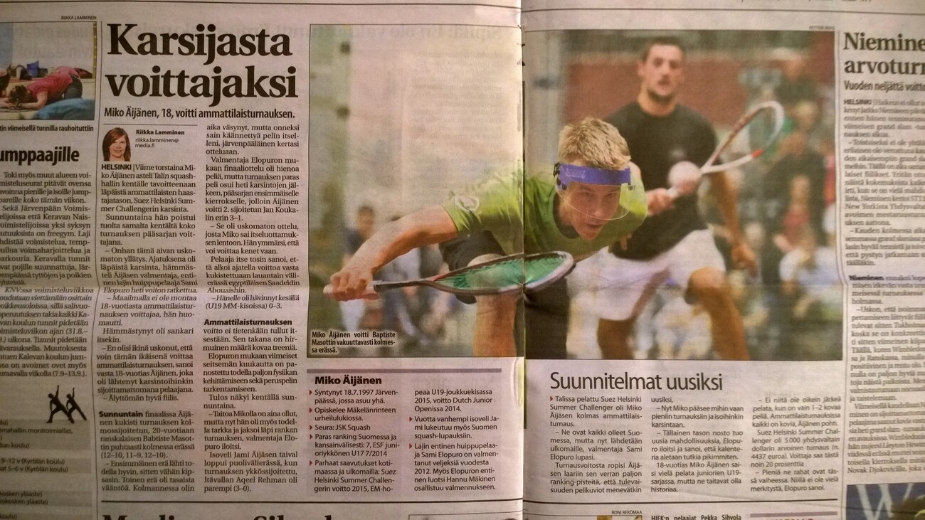 Viime viikolla pelattu Suez Helsinki Summer Challenger PSA-turnaus päättyi sunnuntaina iloisiin suomalaistunnelmiin. Miko Äijäsen tarunhohtoinen eteneminen tässä kilpailussa hakee vertaistaan. Karsintojen kautta 5´000 dollarin ammattilaisturnauksen voittoon on uskomattoman hieno saavutus nuorelta järvenpääläiseltä. Loppuottelussa Miko voitti Ranskan Baptiste Masotti'n erin 3-0 (12-10, 11-9, 12-10). Loistavaa Miko! Suomalaismenestystä täydensivät Jami Äijänen, JSK ja Jaakko Vähämaa, ESRC selviytymällä turnauksen puolivälieriin. Klikkaa uutisotsikkoa, niin löydät alla kisamateriaalia koottuna Otteluraportti ja tunnelmat finaalin jälkeen Mikon haastattelu ja palkintojen jako (postaus tehty su iltana n. klo 18.00, scrollaa FB-sivua riittävän alas) Finaaliottelu kokonaisuudessaan YouTubessa (katso kohdasta 7:32:00 lähtien) Timo Havulinnan valokuvat finaalipäivänä Petteri Revon kisa-albumi: https://picasaweb.google.com/repozilla/SuezSummerChallenger?authuser=0&feat=directlink Oheiset kuvat: Petteri Repo Liitteet