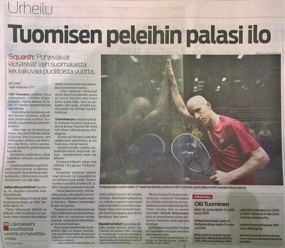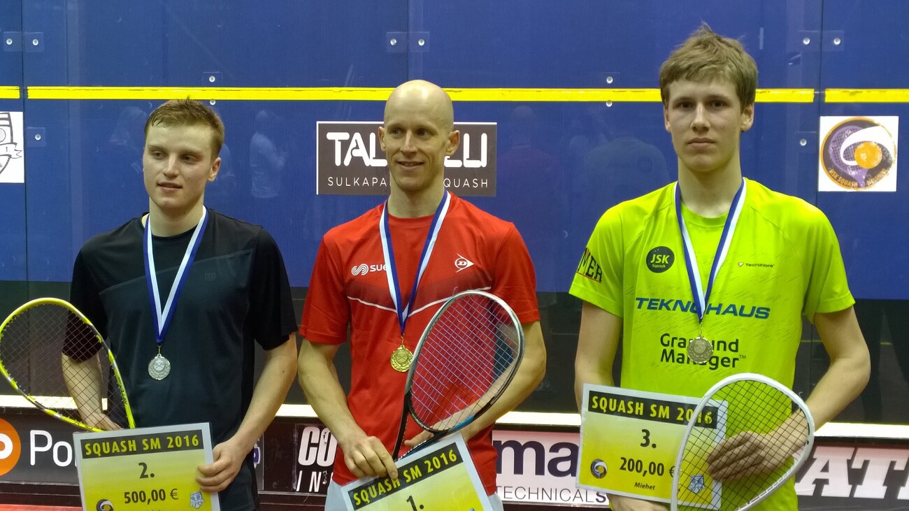 Viikonloppuna pelatut SM-kilpailut päättyivät iloisiin tunnelmiin. Jami Äijänen voitti jo uransa toisen Yleisen luokan SM-mitalinsa, kun hän Talihallissa pelatun turnauksen pronssiottelussa kukisti ESRC:n Jaakko Vähämaan tiukassa viiden erän kamppailussa. SM-turnauksen sijoille 5.-8. seedattu Jami Äijänen pelasi hienon turnauksen. Hän voitti puolivälierässä 3.-4. seedatun ESRC:n Matias Tuomen 3-1, taisteli välierässä vahvasti lajilegendaa ja 1.-sijoitettua Olli Tuomista, KSQ vastaan ja voitti pronssiottelussa 2.-sijoitetun, ESRC:n Jaakko Vähämaan huikeassa trillerissä 3-2. Jamin pronssimatsi oli erittäin vaiherikas ottelu. Jaakko aloitti vahvasti ja näytti vievän himmeimmän mitalin näytöstyyliin. Ensimäisessä ja toisessa erässä Jaakon peruslyönti kulki hyvin, liike oli sulavaa ja rystypuolen stopparit ja shotit toimivat miltei virheittä. Jami oli kuitenkin päättänyt taistella ja pikku hiljaa hän kipusi ottelun aikana rinnalle ja lopulta ohi. Viides ja ratkaiseva erä oli järvenpääläisen squashtaiturin todellista näytöstä. Peruslyöntien lisäksi mm. näyttävät taitolyönnit ja ns. shotit alkoivat purra murhaavalla prosentilla. Viides erä oli huikeaa katseltavaa. Pronssiottelun ratkettua, Jami oli selvästi iloinen saavutuksestaan. "Ottelun alussa pelasin vielä tahmeasti, mutta kolmannesta erästä lähtien lyöntini kulki aina vaan paremmin", kommentoi urallaan jo toisen Yleisen luokan SM-pronssimitalin saavuttanut Jami. Edellinen pronssi tuli vuonna 2014. Suomen mestaruuden 2016 valloitti Olli Tuominen, KSQ ja hopealla sijoittui Kristian Rautiainen, Helsinki Senators, JSK Squash menestystä täydensi Sami Lithenius nappaamalla D-luokan pronssimitalin. Myös Ville Karsikas pelasi vahvan turnauksen ja selvisi SM-turnauksessa sijoille 5.-8. Talihalliin oli tullut sankka joukko ihmisiä seuraamaan sunnuntain ratkaisuotteluita, tunnelma oli kerrassaan hieno. Petteri Revon kisakuvia: https://picasaweb.google.com/repozilla/SMSquash2016?feat=email YLE Urheiluruutu (ks. kohta 15.15-16.15min): http://areena.yle.fi/1-3064129 Keski-Uusimaa: http://www.keski-uusimaa.fi/artikkeli/365049-jami-aijanen-vei-sm-pronssia-talista (lisää uutisesta lehden printtiversiossa) Iltasanomat: http://www.iltasanomat.fi/muutlajit/art-1455424804536.html Helsingin Sanomat: http://www.hs.fi/urheilu/a1455777676277?jako=c9e726a22d0996141339de67cb6ef6db&ref=tw-share