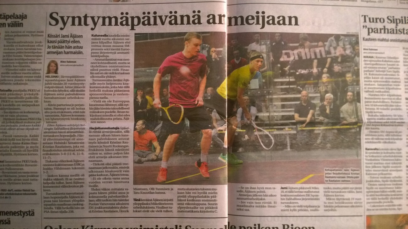 Kevään suuri squashkarnevaali, JSK Squashin Talihallissa 15.-17.04 järjestämä Salming Squash Open päättyi sunnuntaina finaaliotteluihin. Miesten pääsarjassa Jami Äijänen sijoittui toiseksi. Päivitys, ma 18.04, klo 21.15 Kovaa vääntöä, huikeaa fyysistä rutistusta ja pitkiä palloralleja: näistä oli tämän vuoden Salming Squash Openin miesten sarjan mitaliottelut tehty. Jami Äijänen on lunastanut paikkansa suomalaisena kärkipelaajana ja tällä kertaa tuli palkinnoksi Eliittikisan toinen sija. Voiton nappasi Helsinki Senatorsin Kristian Rautiainen, joka kukisti finaalissa Jamin 3-0 (11-6, 11-9, 11-7). Pronssiottelussa ESRC:n Tatu Knuutila kaatoi tiukassa viiden erän mittelössä seurakaverinsa Jaakko Vähämaan 3-2. Liitteistä löytyy myös sanomalehti Keski-Uusimaan juttu kisoista.