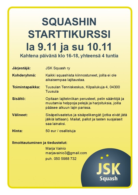 Kaikille squashista kiinnostuneille, joilla ei ole aikaisempaa lajitaustaa. Järjestäjä: JSK Squash ry Kohderyhmä: Kaikki squashista kiinnostuneet, joilla ei ole aikaisempaa lajitaustaa. Toimintapaikka: Tuusulan Tenniskeskus, Kilpailukuja 4, 04300 Tuusula Sisältö: Opitaan lajitekniikan perusteet, pelin sääntöjä ja muutamia helppoja pelejä ja harjoituksia, joilla pääsee alkuun lajin parissa. Välineet: Sisäpelivaatetus ja sisäpelikengät (jotka eivät jätä jälkiä lattiaan). Mailat, pallot ja lasten suojalasit saa lainaksi. Hinta: 50 eur / osallistuja