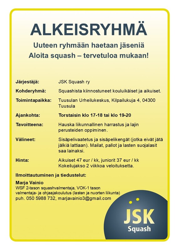 Aloita squash - tervetuloa mukaan! Järjestäjä: JSK Squash ry Kohderyhmä: Squashista kiinnostuneet kouluikäiset ja aikuiset. Toimintapaikka: Tuusulan Urheilukeskus, Kilpailukuja 4, 04300 Tuusula Ajankohta: Torstaisin klo 17-18 tai klo 19-20 Tavoitteena: Hauska liikunnallinen harrastus ja lajin perusteiden oppiminen. Välineet: Sisäpelivaatetus ja sisäpelikengät (jotka eivät jätä jälkiä lattiaan). Mailat, pallot ja lasten suojalasit saa lainaksi. Hinta: Aikuiset 47 eur / kk, juniorit 37 eur / kk Kokeilujakso 2 viikkoa veloituksetta. Ilmoittautuminen ja tiedustelut: Marja Vainio WSF 2-tason squashvalmentaja, VOK-1 tason valmentaja- ja ohjaajakoulutus (lasten ja nuorten liikunta) puh. 050 5988 732, marjavainio3@gmail.com |